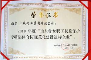 2018年12月,山東省總工會(huì)授予日照興業(yè)集團(tuán)“2018年度山東省女職工權(quán)益保護(hù)專(zhuān)項(xiàng)集體合同規(guī)范化建設(shè)達(dá)標(biāo)企業(yè)”