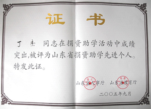 · 2005年9月,丁杰董事長榮獲“山東省捐資助學(xué)先進(jìn)個人”榮譽(yù)稱號