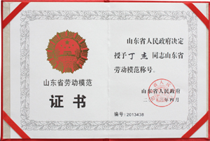 ·2013年4月,山東省人民政府授予丁杰董事長“山東省勞動模范”稱號