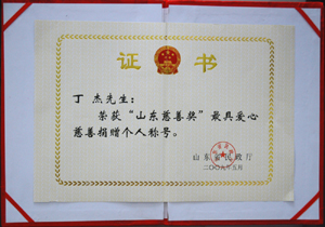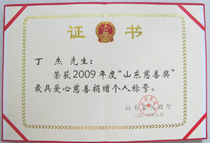 · 2009年5月,丁杰董事長榮獲“山東慈善獎”最具愛心慈善捐贈個人榮譽(yù)稱號
