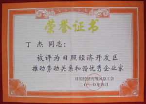 · 2010年4月,丁杰董事長榮獲“日照經(jīng)濟(jì)開發(fā)區(qū)推動勞動關(guān)系和諧優(yōu)秀企業(yè)家”榮譽(yù)稱號