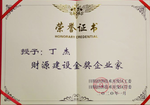 ·2020年1月,日照經(jīng)濟(jì)技術(shù)開發(fā)區(qū)授予丁杰“財源建設(shè)金獎企業(yè)家”